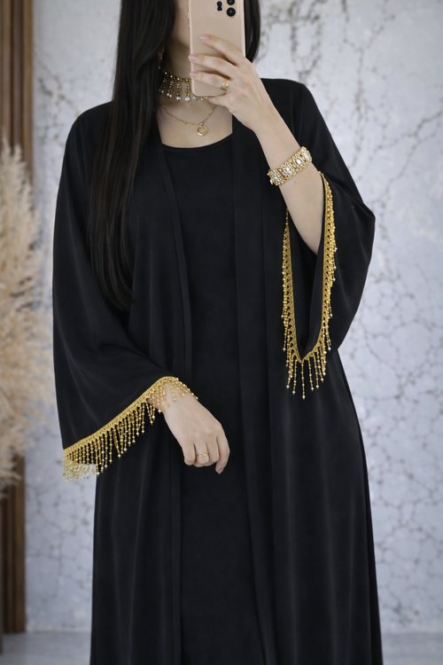 عباية مفتوحة بهدب عقيق مع ثوب كريب – أناقة فاخرة